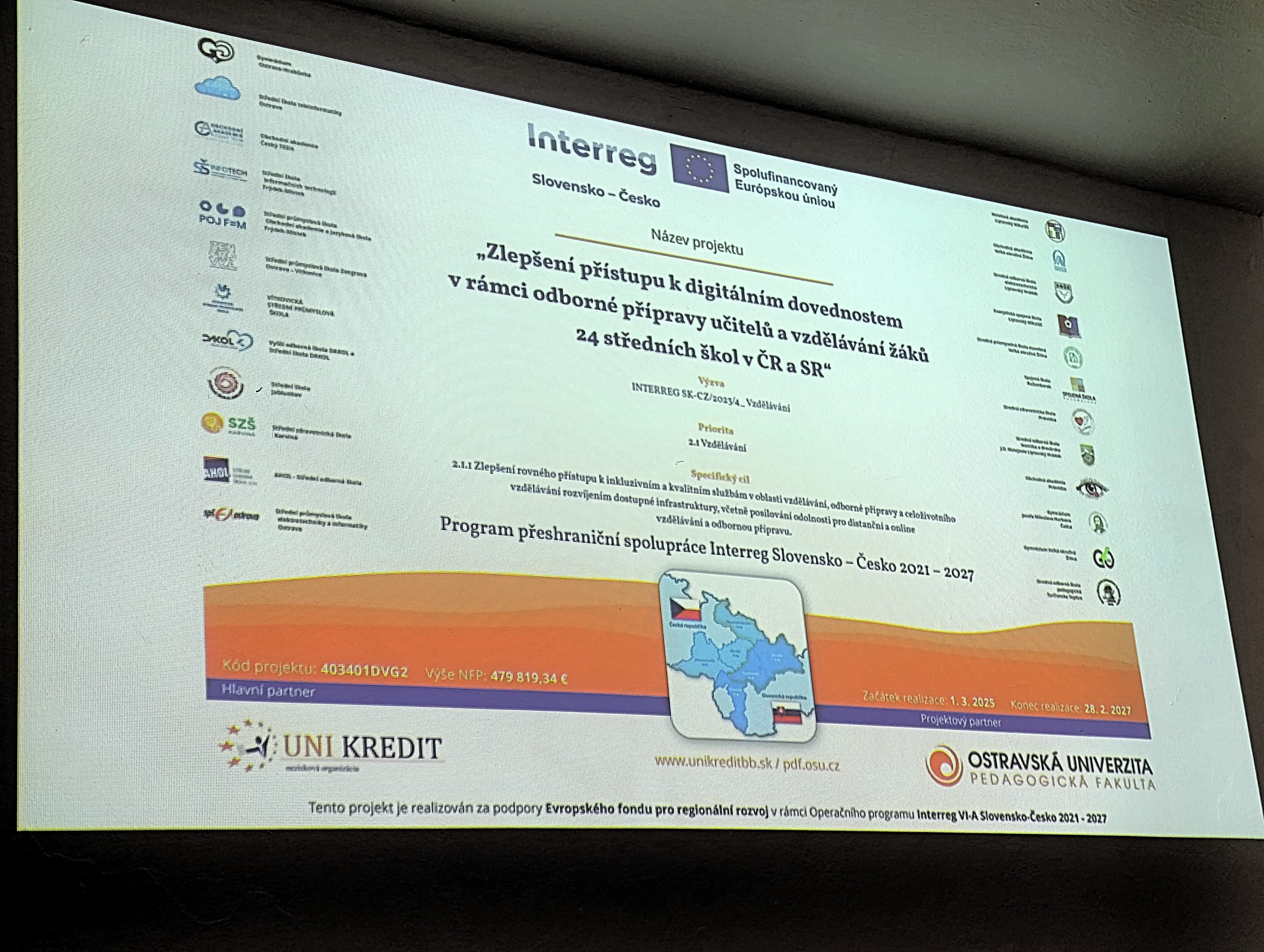 Naše škola se zapojila do významného mezinárodního projektu „Zlepšení přístupu k digitálním dovednostem v rámci odborné přípravy učitelů a vzdělávání žáků“, který probíhá v letech 2025–2027. Projekt, realizovaný pod záštitou Ostravské univerzity, propojuje střední školy v České republice i na Slovensku a zaměřuje se na kvalitní digitální vzdělávání, rozvoj moderních kompetencí a podporu učitelů v práci s IT a umělou inteligencí.